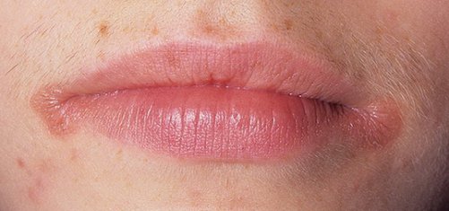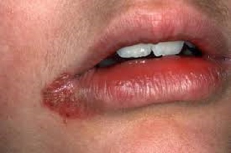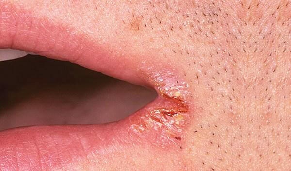 Такое состояние проявляется в виде трещин на губах, сопровождающихся покраснением и мелкими высыпаниями в центральной части. Язвы имеют красный оттенок, а губы становятся отечными и сухими.