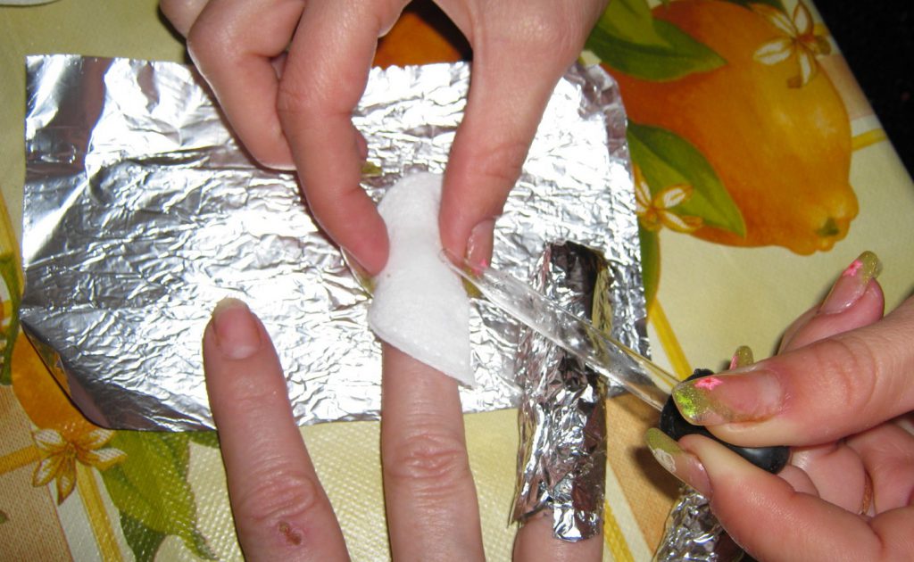 - После размягчения воспользуйтесь маникюрными инструментами, чтобы аккуратно удалить смягченный верхний слой ногтя.