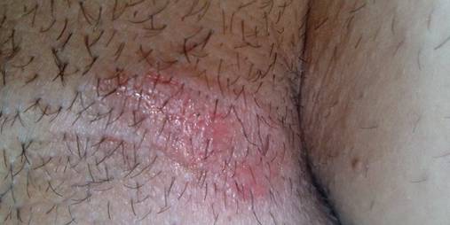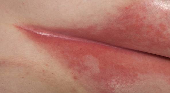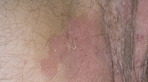 Начавшись со слизистых оболочек половых органов, инфекция может распространиться на кожу в области паховых складок. В этом случае появляются зудящие розовые пятна, которые сопровождаются шелушением.