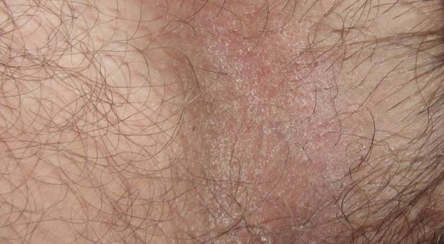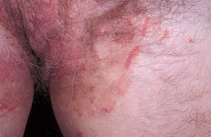 При микозе, локализующемся в паховых и межягодичных складках, также может поражаться кожа полового члена и туловища (фото).